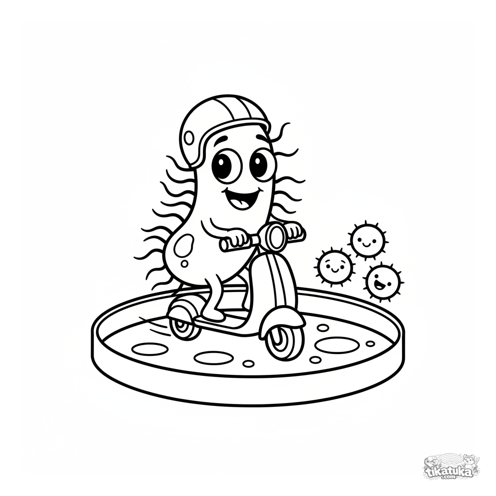 Página para colorear fácil para niños pequeños: un microbio feliz con ojos grandes monta un scooter en una placa de Petri. Para niños de 2 a 5 años.