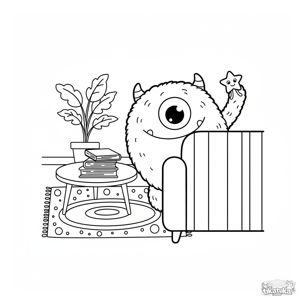 Página para colorear para niños 4-6: un monstruo peludo con un ojo asomándose tras el sofá. Escena divertida.