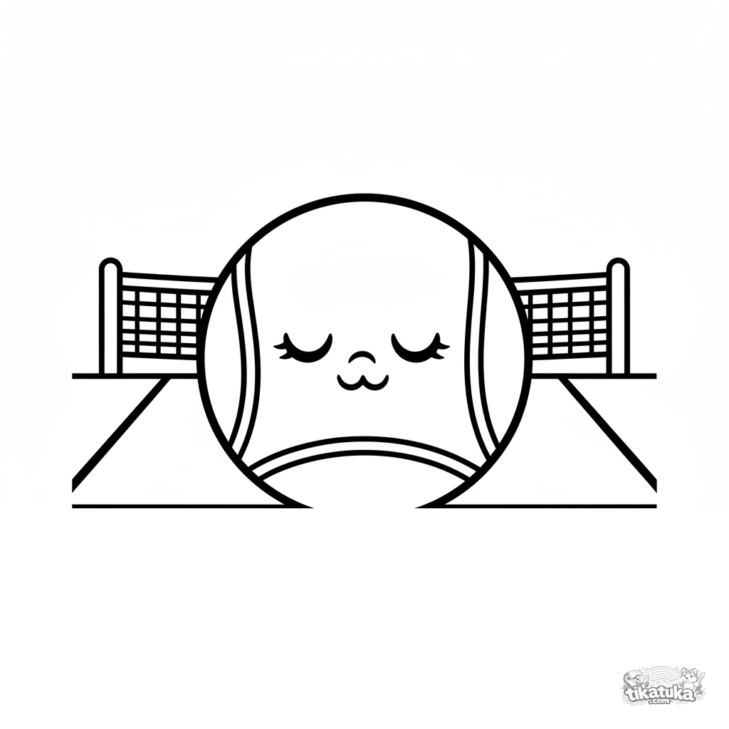 Página simple para colorear para bebés de 2-3 años: una gran pelota de tenis de peluche con cara descansando en la línea de la cancha.