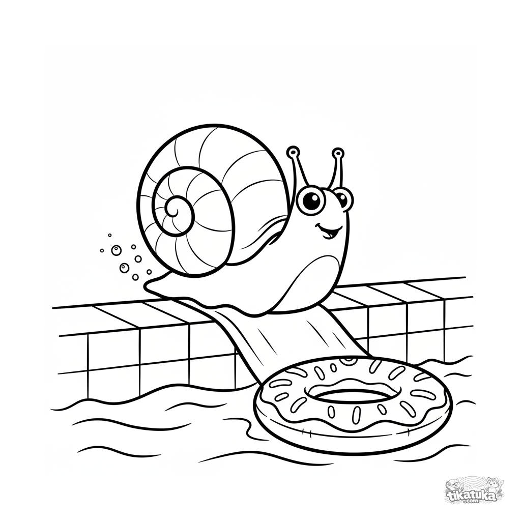 Página para colorear para niños de 4-6 años: un caracol feliz se desliza por la pared hacia un flotador en el fondo. Escena juguetona, contornos claros, cara linda.