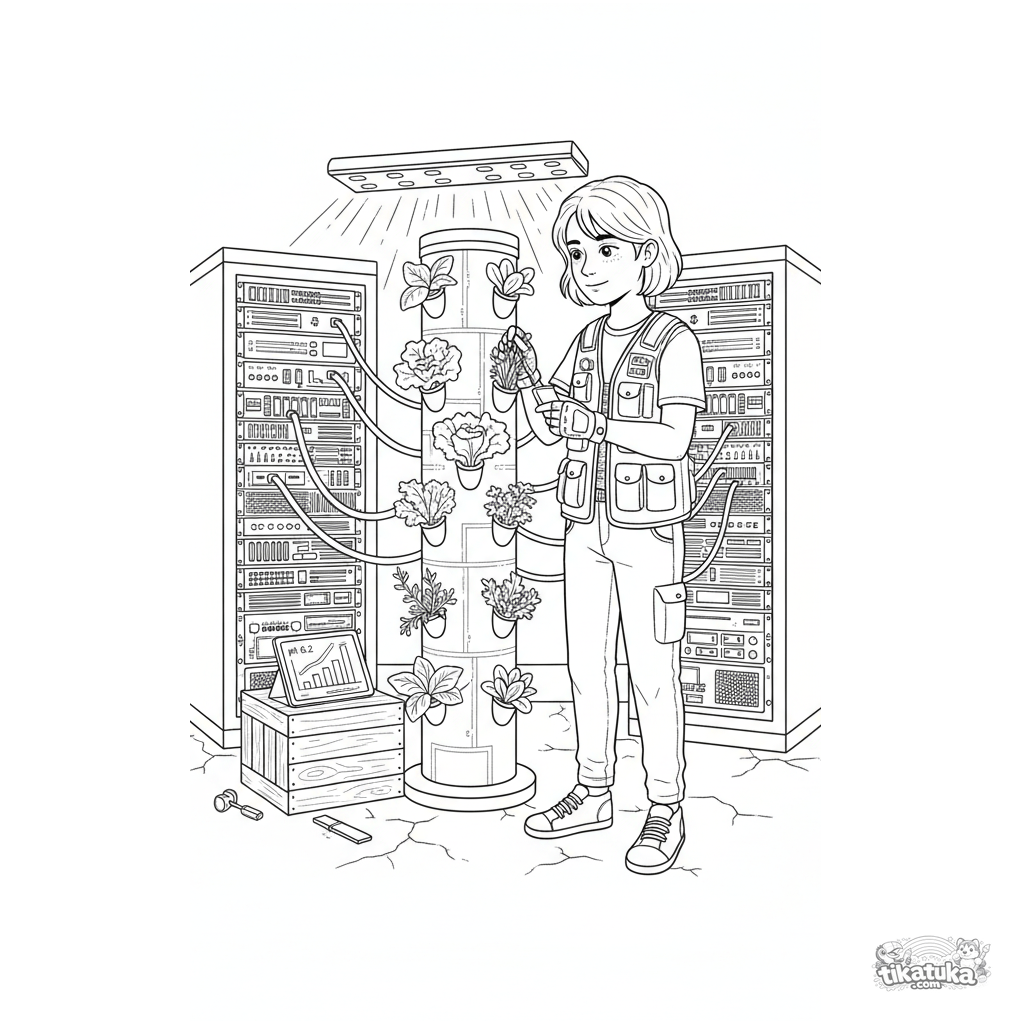 Página para colorear para 10-12 años: un adolescente jardinero cibernético cuida una torre hidropónica entre servidores en un sótano. Escena futurista detallada.