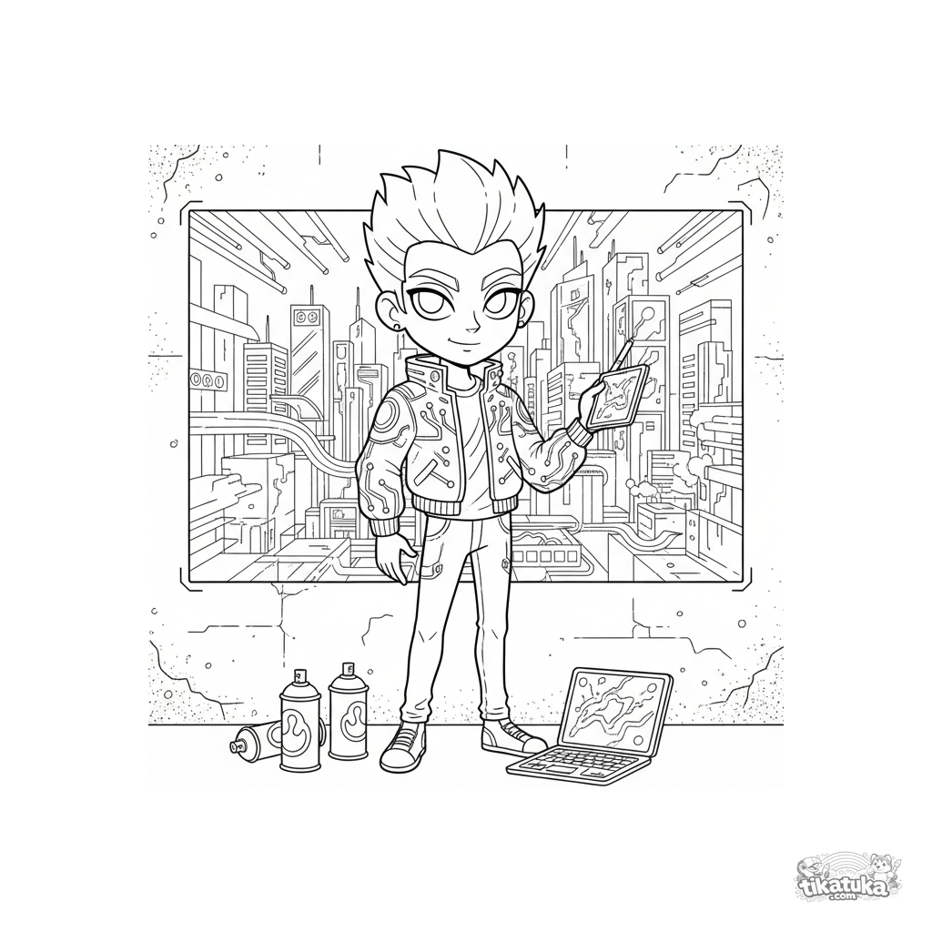 Página para colorear para niños de 10-12 años: un artista de graffiti cyberpunk crea un mural digital en un sótano. Escena dinámica en estilo manga de acción.