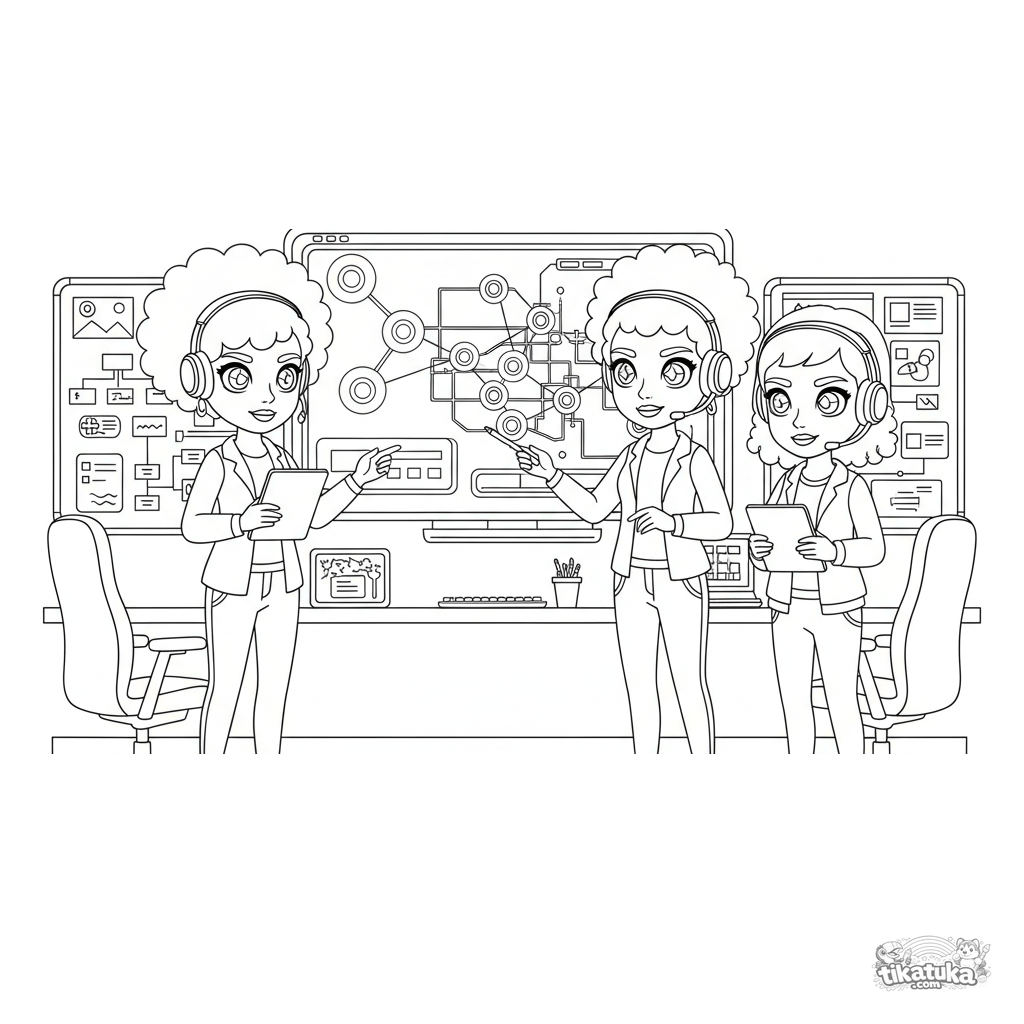 Página para colorear: un equipo de ciberseguridad planea una operación en un centro de mando de sótano de alta tecnología. Muchos detalles.
