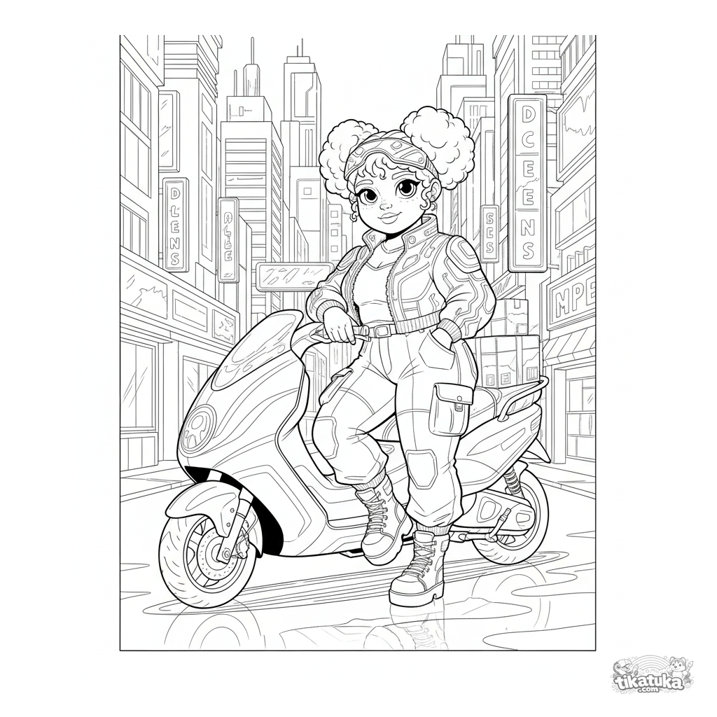 Página para colorear estilo novela gráfica para 10-12 años: una mensajera cyberpunk en un paisaje urbano de neón. Escena muy detallada con scooter flotante y hologramas.