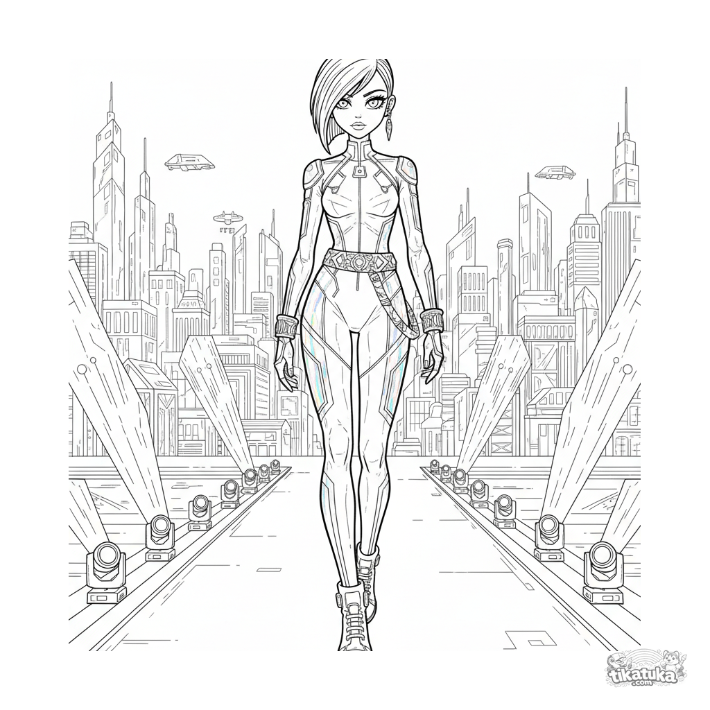 Página compleja estilo manga para colorear: una modelo en mono holográfico camina por una pasarela neón. Escena dinámica con luces geométricas y fondo futurista para niñas 10-12.