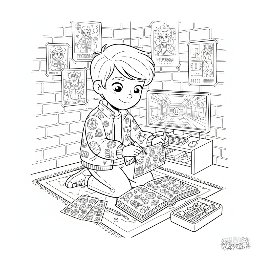 Página para colorear: un adolescente coleccionista de pegatinas en un sótano hacker acogedor. Muchos detalles: pósters, monitor, herramientas.