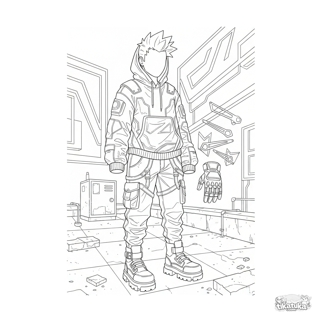 Página para colorear compleja: conjunto de ropa cyberpunk en disposición plana en una azotea. Para 10-12 años, alto detalle en ropa y fondo urbano.