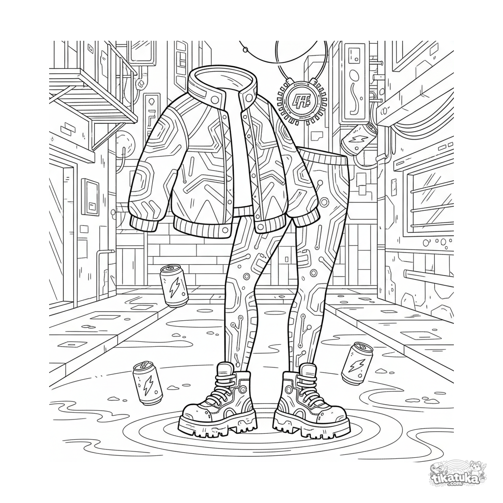 Página compleja para colorear para niñas: un conjunto de ropa cyberpunk tendido en un callejón de neón. Chaqueta holográfica, accesorios tecnológicos, fondo urbano detallado.
