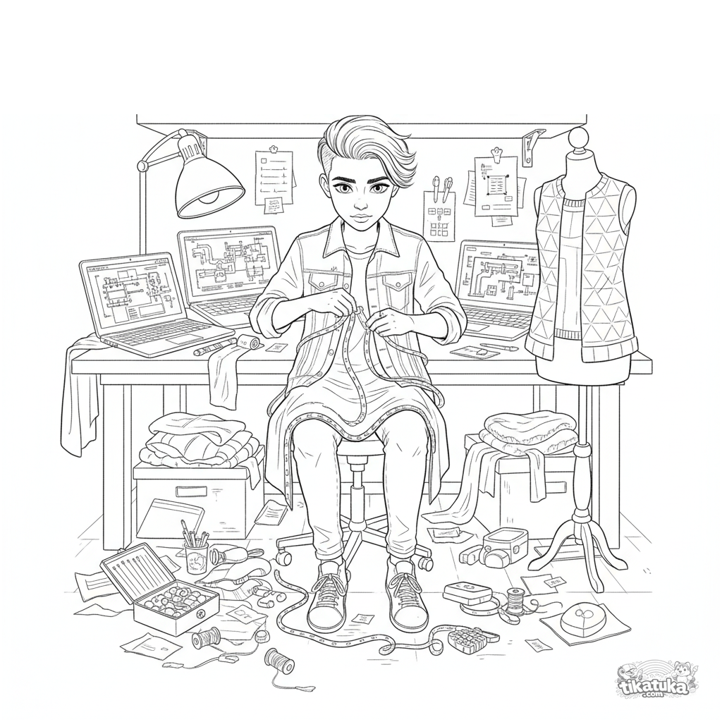 Página para colorear para 10-12 años: un adolescente en un sótano hacker crea una chaqueta LED. Herramientas, telas y esquemas detallados para colorear de forma atractiva.
