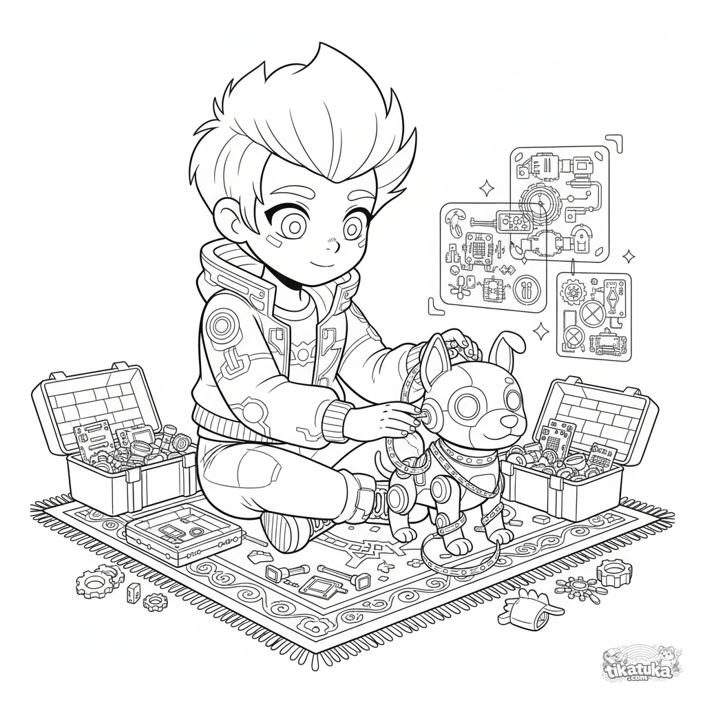 Página para colorear para niños de 10-12 años: un adolescente con estilo cyberpunk personalizando una mascota robot en un sótano con herramientas y pantallas holográficas.