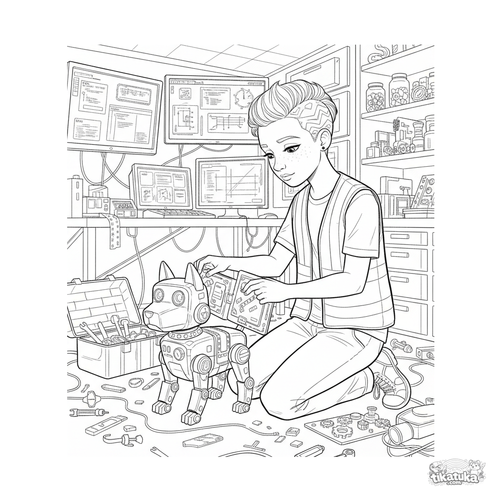 Página para colorear para niños 10-12: un adolescente estilo cyberpunk modifica un perro robot en un taller del sótano. Detalles: herramientas, cables, pantallas con esquemas.