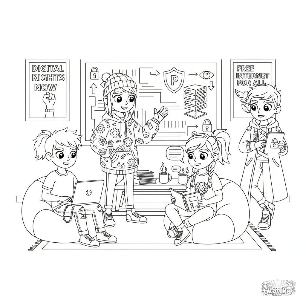 Página para colorear para 10-12 años: un equipo de entusiastas de la criptografía debate en un sótano. Posturas detalladas, pizarra con código y atmósfera de debate intelectual para colorear.