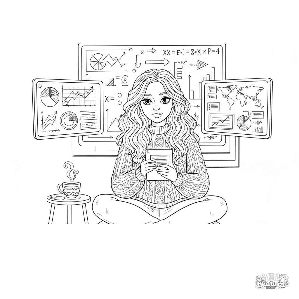 Página para colorear para 10-12 años: un analista de datos trabajando en un panel de múltiples pantallas en un sótano. Detalles: gráficos, mapas, pizarra, té.