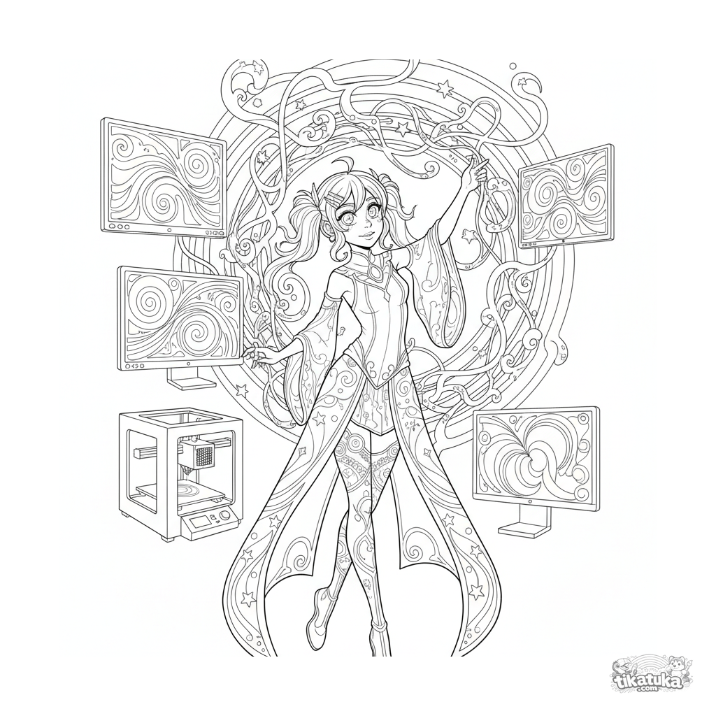 Página para colorear para niños de 10-12 años: un artista en un sótano interactúa con una escultura de datos luminosa. Detalles: pantallas de arte generativo, impresora 3D. Estilo Art Nouveau.