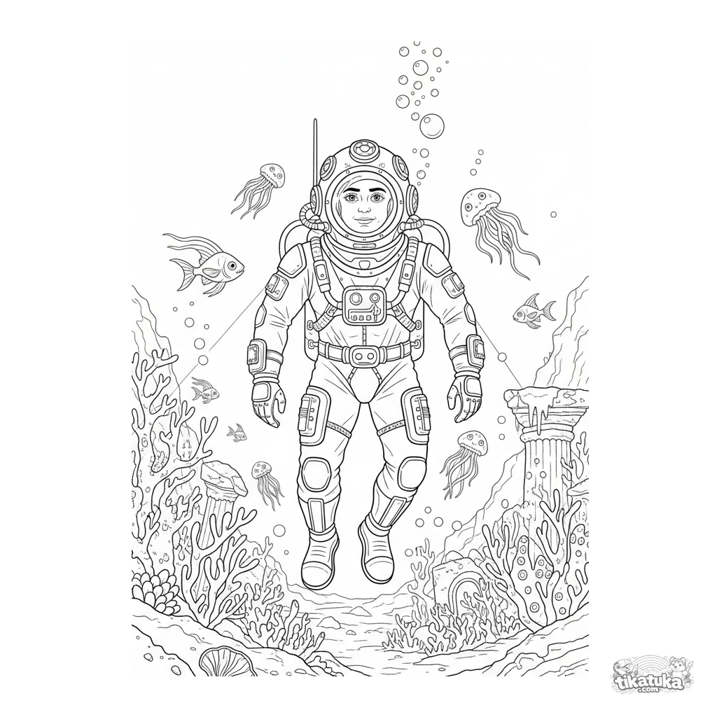 Página para colorear submarina anime detallada: un buzo explora un arrecife de coral brillante en las profundidades del océano. Peces extraños, medusas y ruinas antiguas. Para niños de 10-12 años.