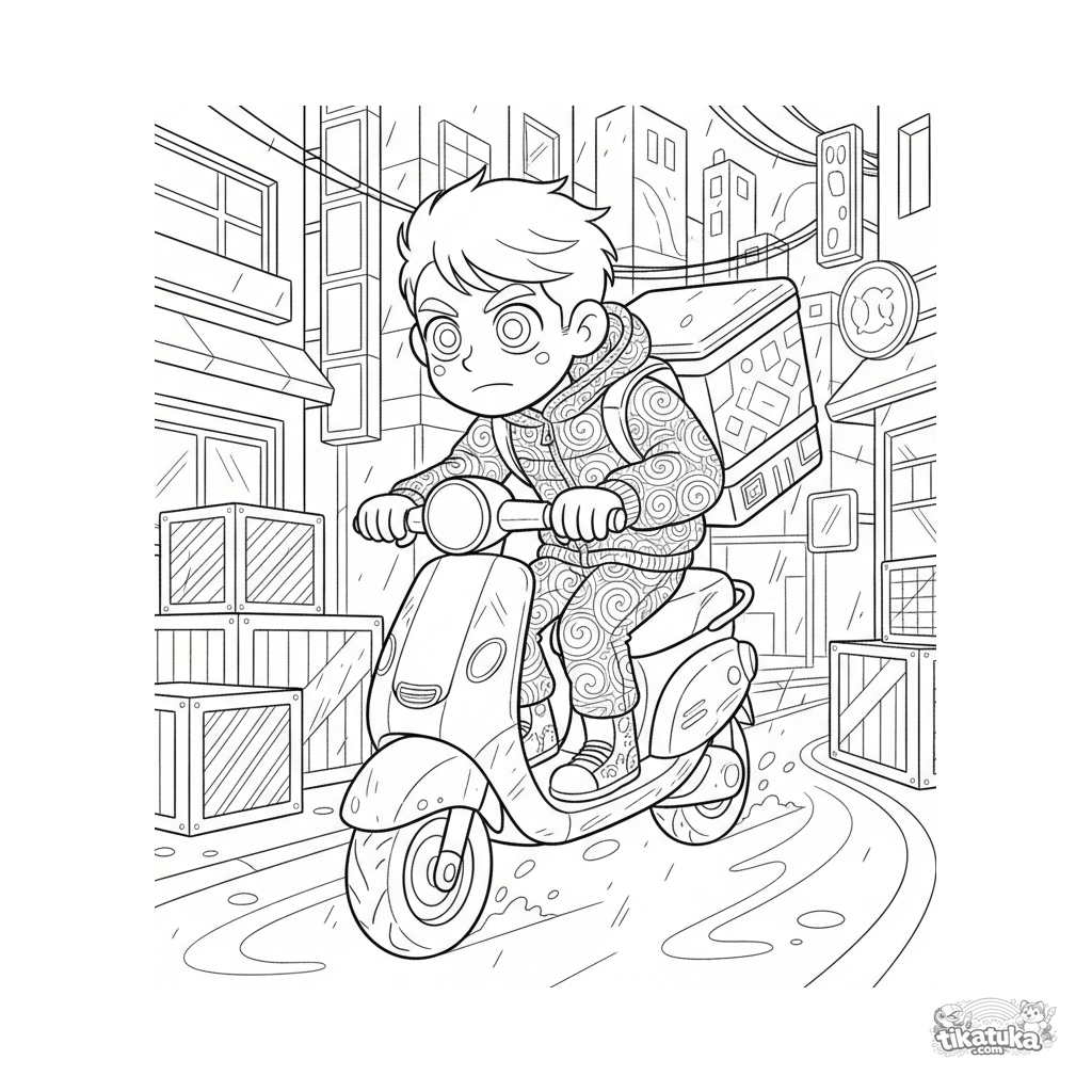 Energética página para colorear estilo manga-acción para 10-12 años: un repartidor en scooter flotante corre por un callejón nocturno con neón, esquivando cajas y letreros luminosos con una caja térmica.
