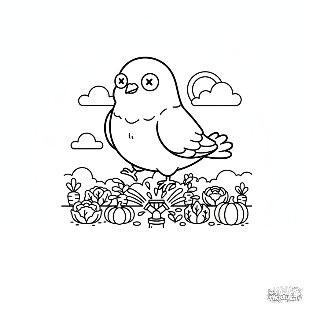 Página para colorear de una paloma divertida equilibrandose en un aspersor. Escena juguetona para niños de 4 a 6 años. Líneas limpias, formas simples y amplios márgenes.