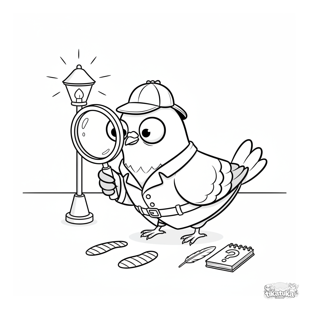 Página para colorear para niños: una divertida paloma detective con sombrero y abrigo examina una huella con una lupa. Estilo juguete, márgenes amplios, para 4-8 años.