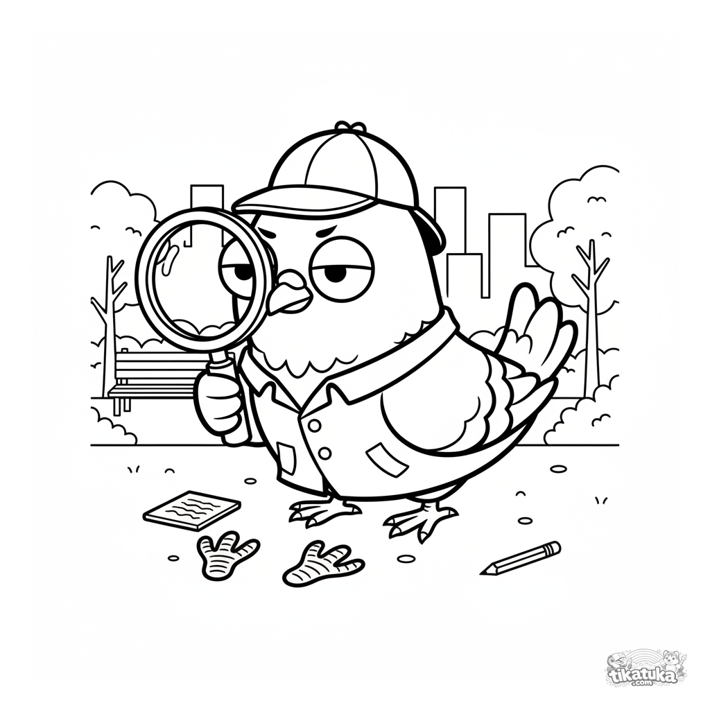 Página para colorear de una paloma detective examinando una huella con lupa en el parque. Para niños de 4 a 6 años. Pájaro divertido en trench y sombrero.
