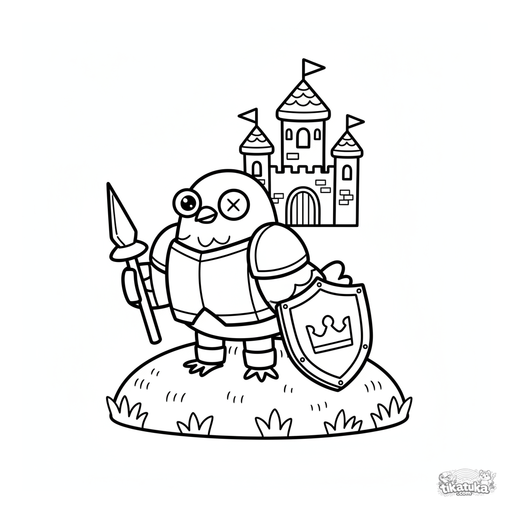 Página para colorear para niños: una divertida paloma caballero en armadura de juguete ante un castillo. Formas simples, márgenes amplios, para 4-8 años.