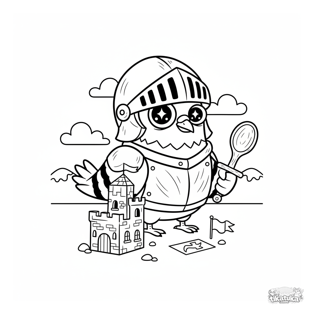 Página para colorear para niños 4-6: un caballero paloma guarda un castillo de cartón. Estilo escandinavo, formas simples, márgenes amplios.
