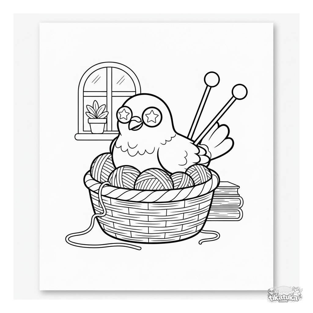 Página para colorear de una paloma tonta haciendo un nido acogedor en una cesta de lana. Para niños de 4 a 6 años.