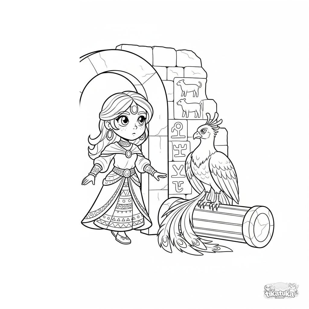 Página para colorear detallada para niños mayores de 10-12 años: una princesa del desierto con brazaletes dorados explora antiguas ruinas de piedra, acompañada por un majestuoso fénix posado en una columna.