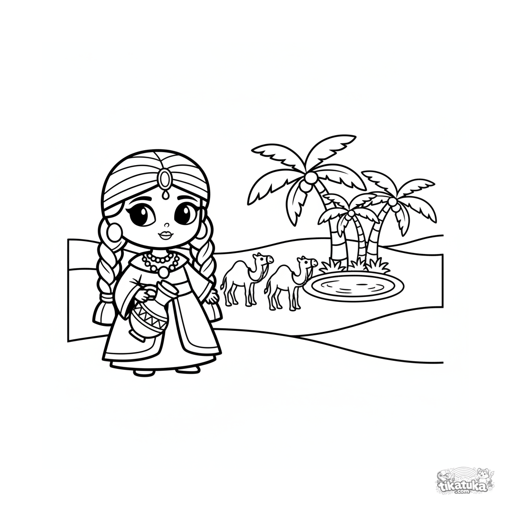 Página para colorear para niños pequeños 2-3: una princesa del desierto guía camellos hacia un oasis con palmeras. Formas grandes y simples.