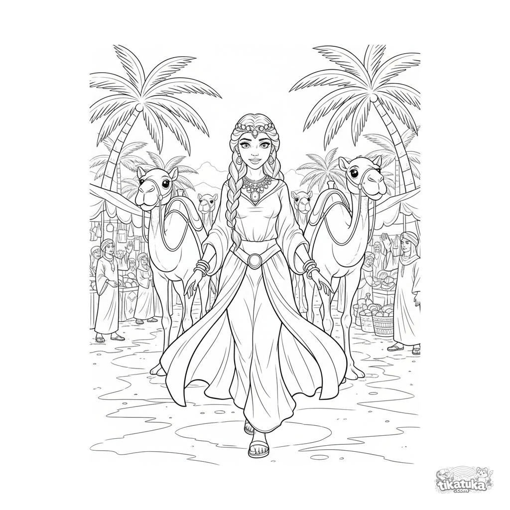 Página para colorear para niños 7-9: una princesa del desierto con joyas de oro guía camellos por un bullicioso mercado del oasis. Escena de celebración y mercado.