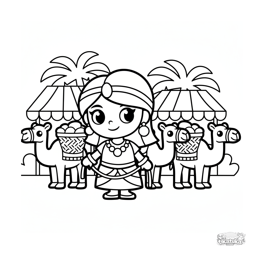 Página para colorear para niños pequeños 2-3: una princesa del desierto liderando camellos por un oasis. Formas grandes y simples, contornos claros.