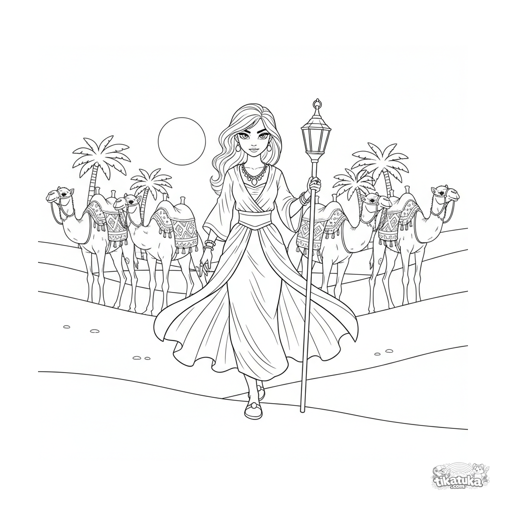 Página para colorear para niños 7-9: una princesa del desierto guía una caravana de camellos por dunas al amanecer hacia un oasis.