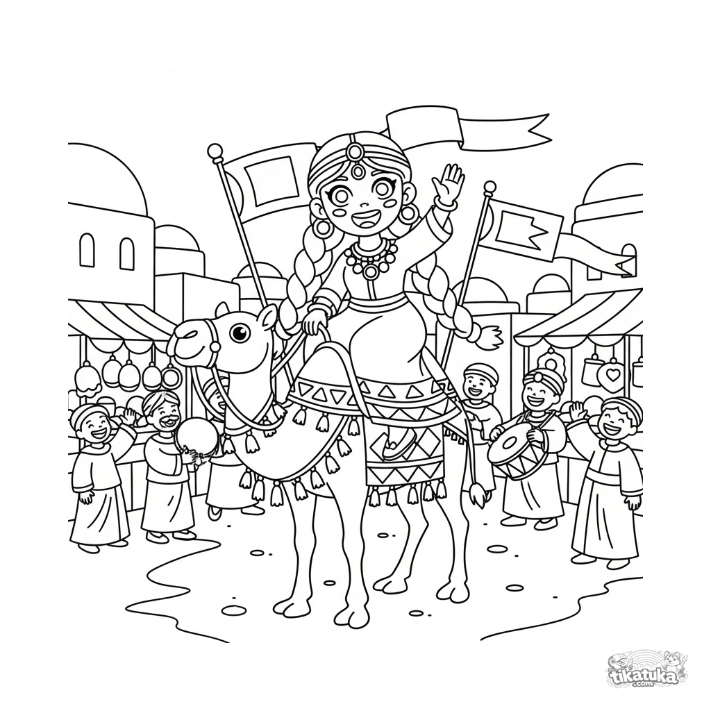 Página para colorear para niños de 4 a 6 años: una princesa del desierto con joyas de oro lidera un desfile festivo en un camello decorado.