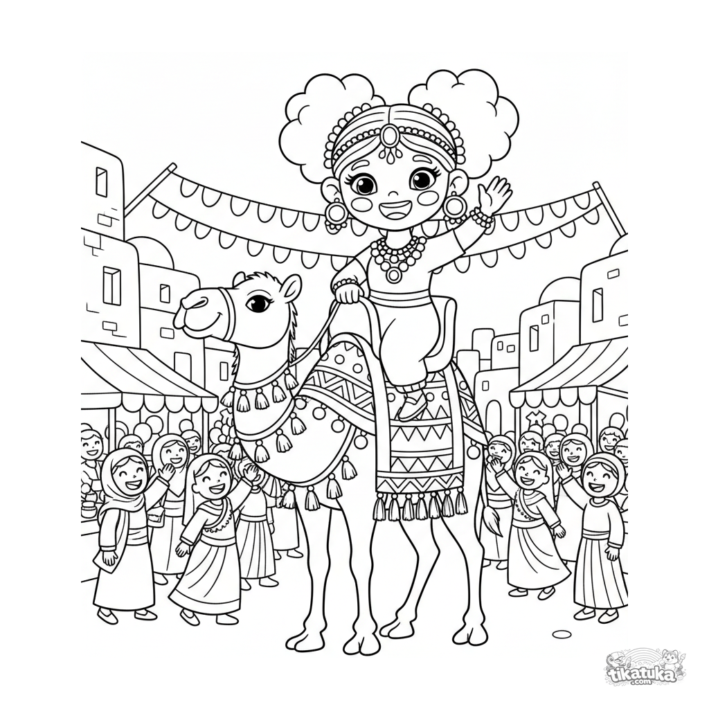 Página para colorear para niños de 7-9 años: una princesa del desierto con joyas de oro lidera un desfile festivo por un bullicioso pueblo mercado.