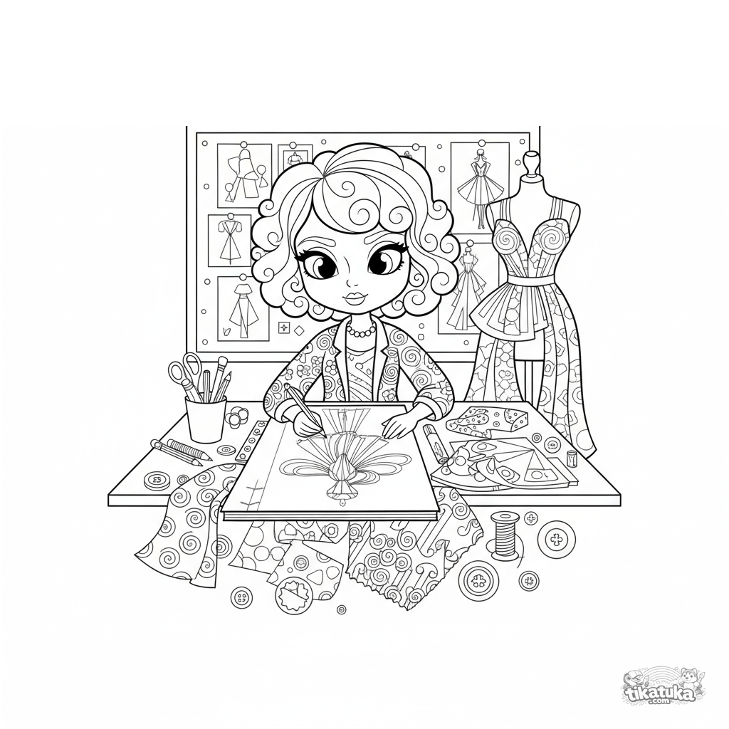 Página para colorear compleja: una diseñadora de moda bosquejando un vestido de vanguardia en un escritorio desordenado. Muchos detalles: muestras de tela, herramientas, maniquí.