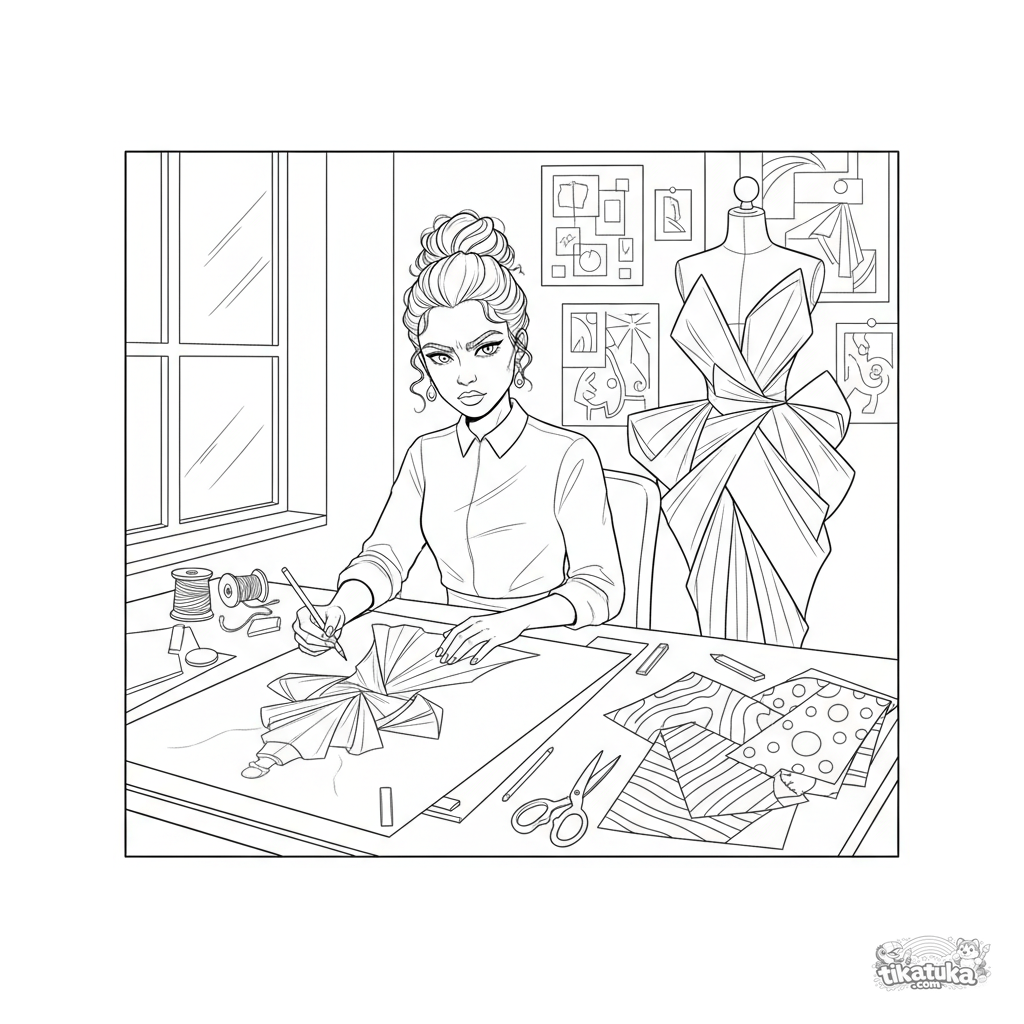 Página para colorear detallada para 10-12 años: una diseñadora de moda en su estudio esbozando un vestido de vanguardia, rodeada de un maniquí, muestras de tela y herramientas creativas.