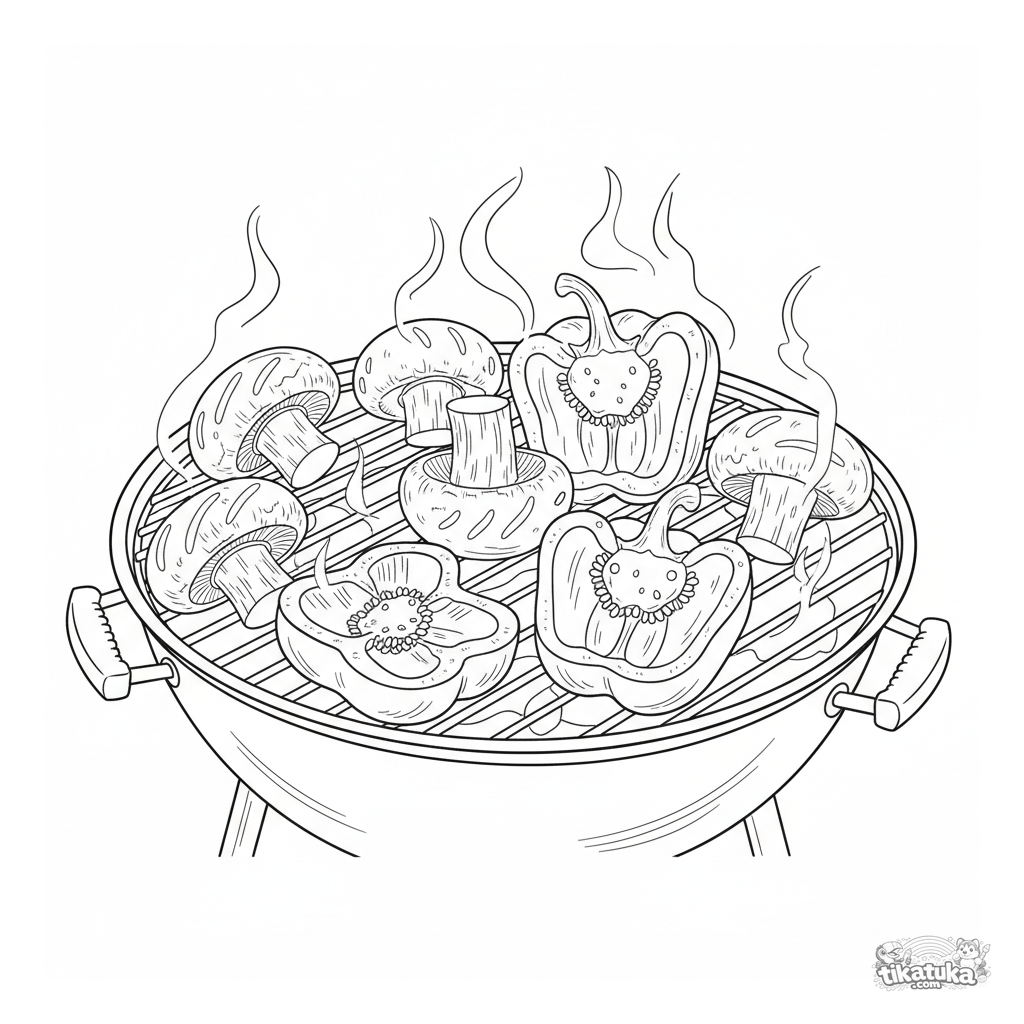 Página para colorear detallada para niños mayores de 10-12 años: un surtido de champiñones y pimientos en una parrilla de jardín. Texturas realistas, efecto de calor.