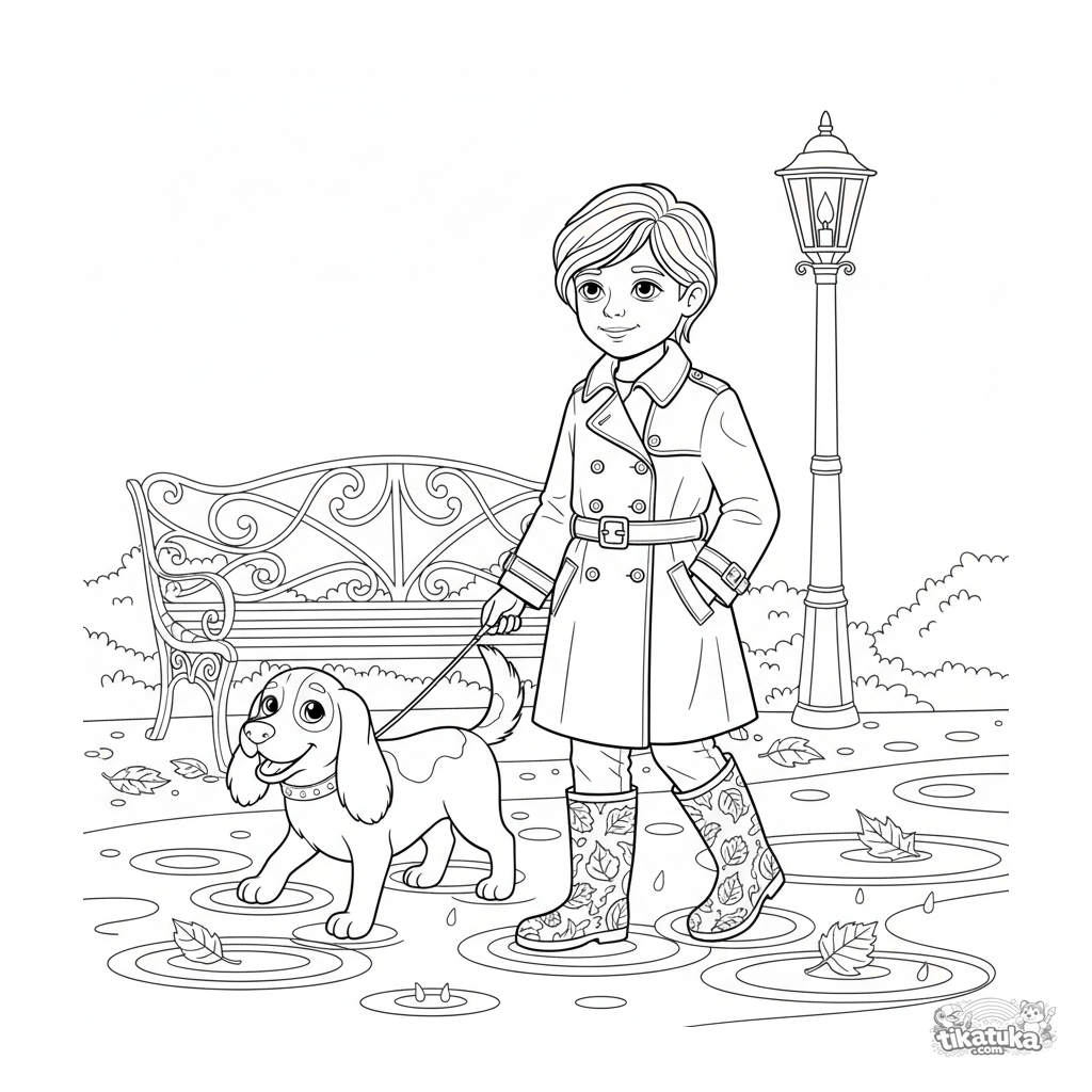 Página para colorear detallada para niños de 10-12 años: un niño con gabardina pasea a un perro bajo la lluvia en un parque de otoño. Escena compleja con texturas de lluvia y hojas.