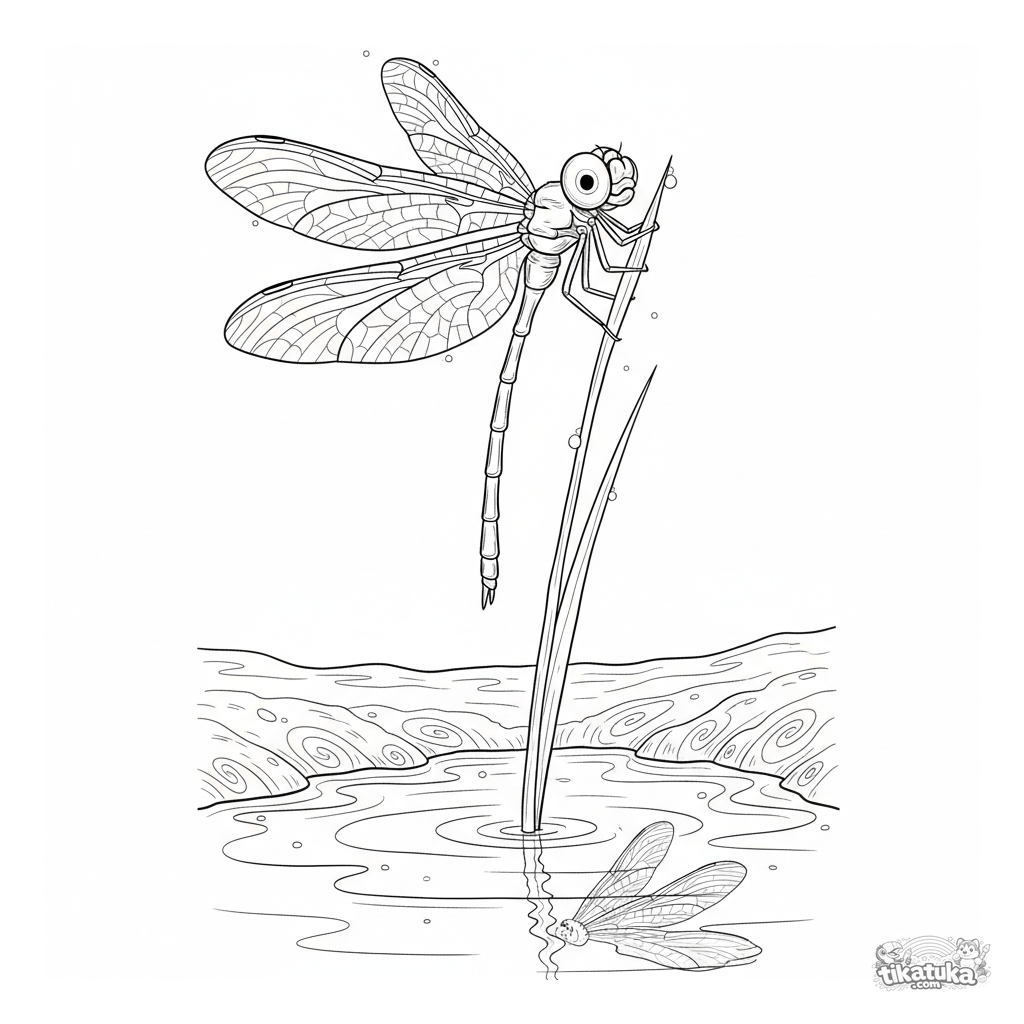 Página para colorear compleja estilo grabado antiguo para 10-12 años: libélula detallada posada en un junco. Líneas finas, patrones de alas, reflejo.