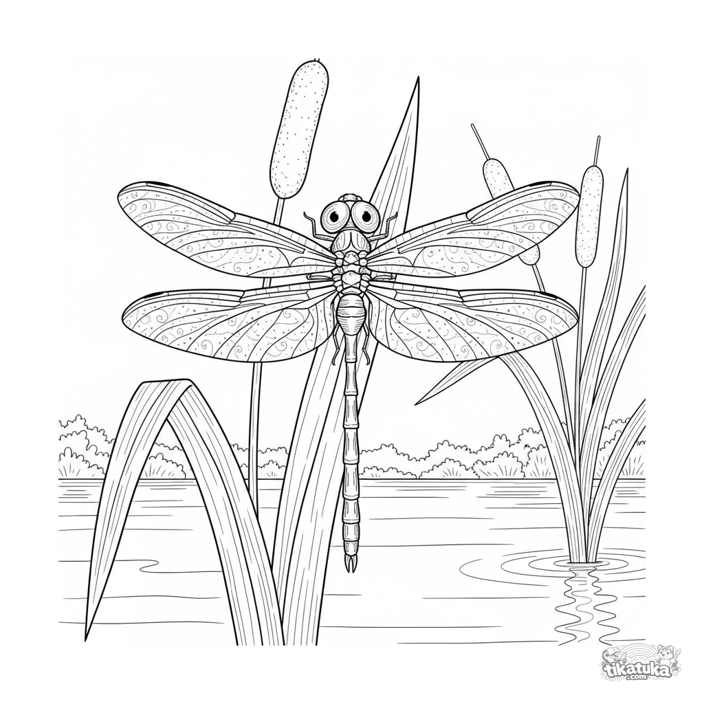 Página para colorear detallada para niños mayores de 10-12 años: una libélula con alas delicadas descansa en una hoja de espadaña junto a un arroyo claro, con otros tallos y reflejos.