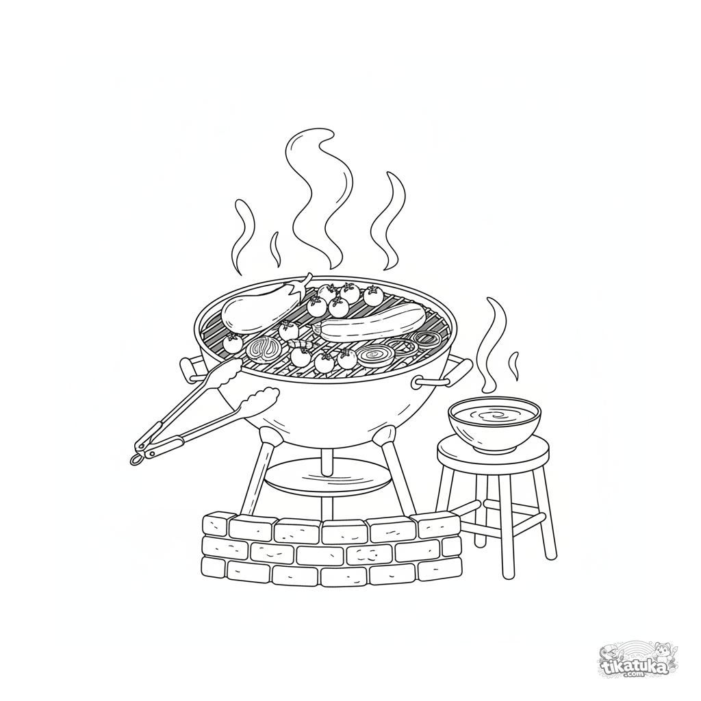 Página para colorear detallada de una parrilla de jardín con berenjena, calabacín, tomates y cebollas, con utensilios. Para 10-12 años.