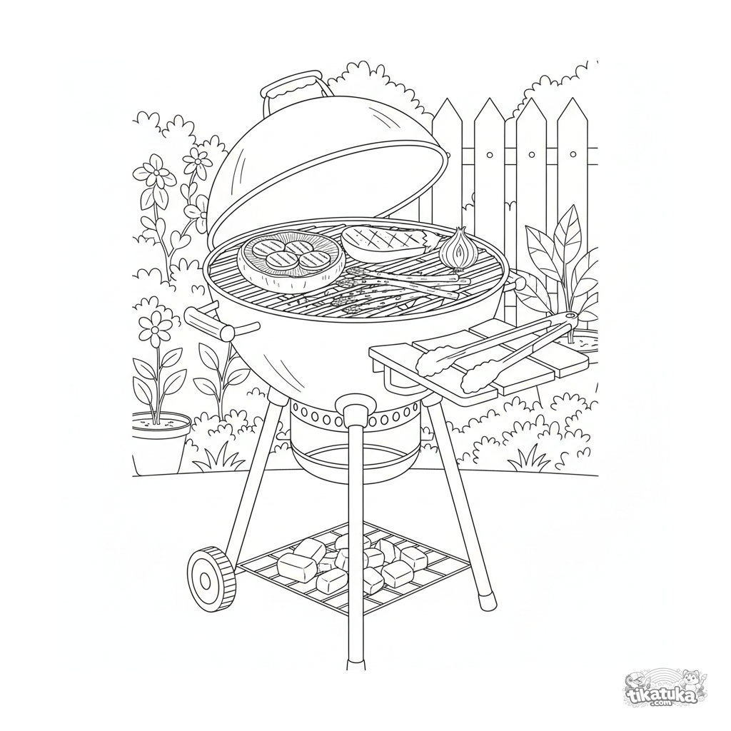 Página detallada para colorear para niños de 10-12 años: una parrilla de jardín llena de varias verduras. Incluye champiñones, berenjena, espárragos, cebolla y utensilios.
