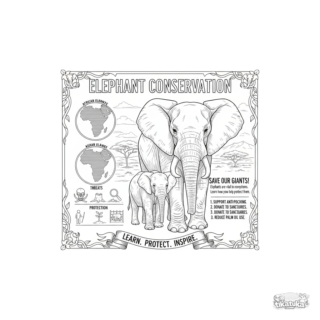 Página para colorear para niños de 10-12 años: un cartel informativo detallado sobre la conservación de elefantes. Ilustración educativa intrincada con mapas y datos.