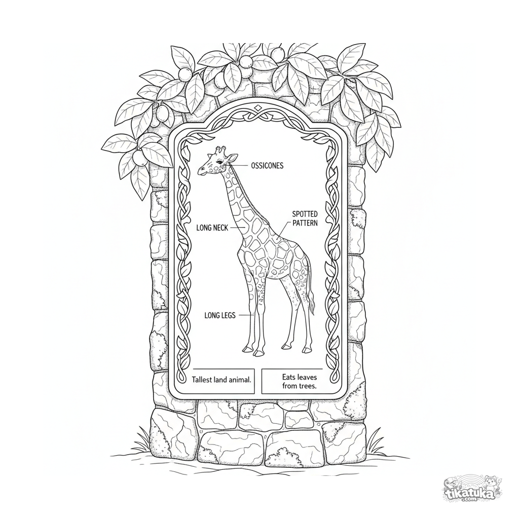 Página para colorear detallada para niños de 10-12 años: una placa informativa con un diagrama anatómico de una jirafa en el zoológico.