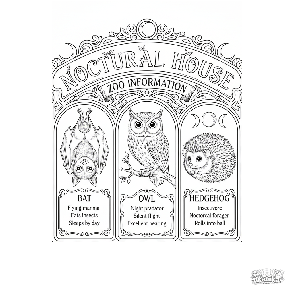Página para colorear compleja para niños 10-12: una ilustración detallada de un letrero de 'Casa Nocturna' del zoológico en estilo grabado antiguo. Incluye murciélago, búho y erizo.