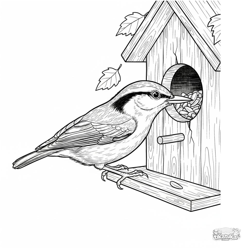 Página para colorear detallada para niños mayores 10-12: un trepador almacenando semillas en las grietas de una casa de pájaros de madera. Estilo grabado, con textura de madera y hojas de otoño.