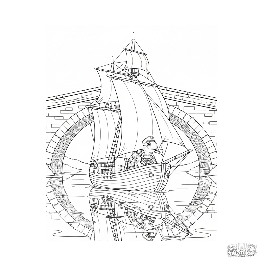 Página para colorear para mayores 10-12: un velero de madera detallado pasa bajo el arco de un puente de piedra sobre un río ancho. Un capitán tortuga está al timón. Líneas limpias y precisas, atmósfera serena.