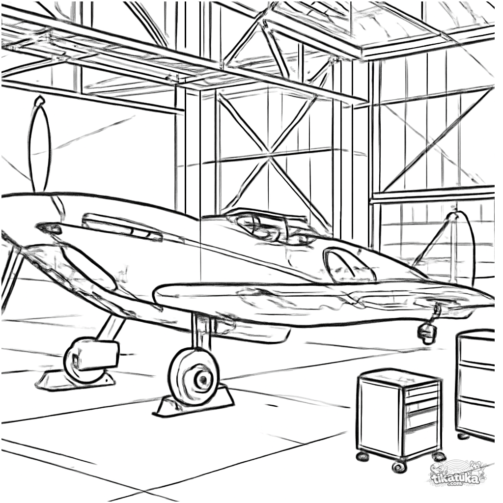Página para colorear de un avión de caza histórico de la WWII dentro de un hangar. Para niños de 8 a 12 años. Representación realista con equipo y luz dramática.