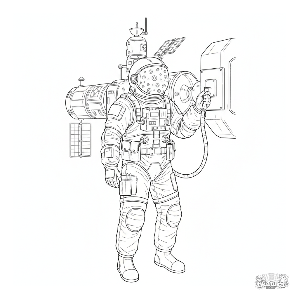Página para colorear detallada para 10-12 años: un astronauta realiza un paseo espacial para trabajar en una estación entre las estrellas. Representación realista.