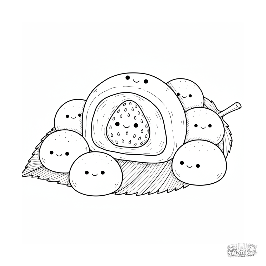 Página para colorear detallada del corte de un mochi de fresa, mostrando el relleno de pasta y fruta. Diseño educativo e intrincado para 10-12 años.