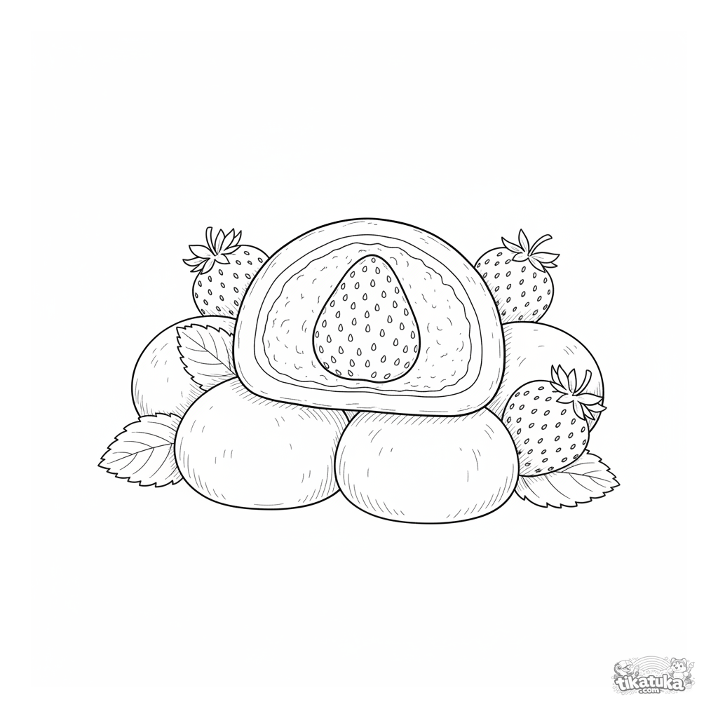Página para colorear compleja para niños mayores 10-12: un corte transversal realista de un mochi de fresa mostrando el relleno de pasta y fresa. Ilustración detallada en estilo científico.